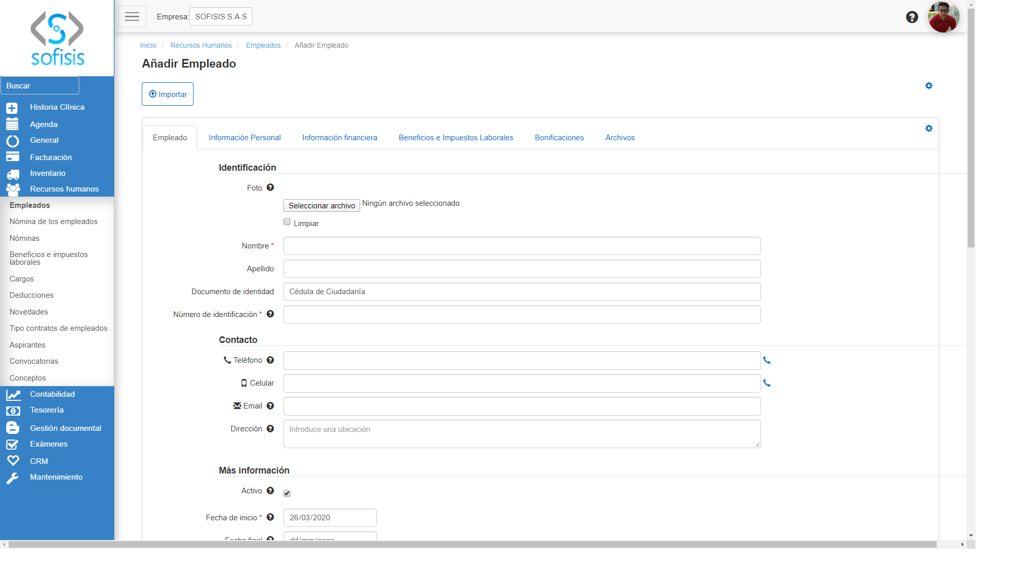 Ahora entremos netamente en la información de los empleados. la diferencia va a estar en los campos se requieren que en este caso son más, como salario, cargo o grupo, prestaciones sociales y demás.